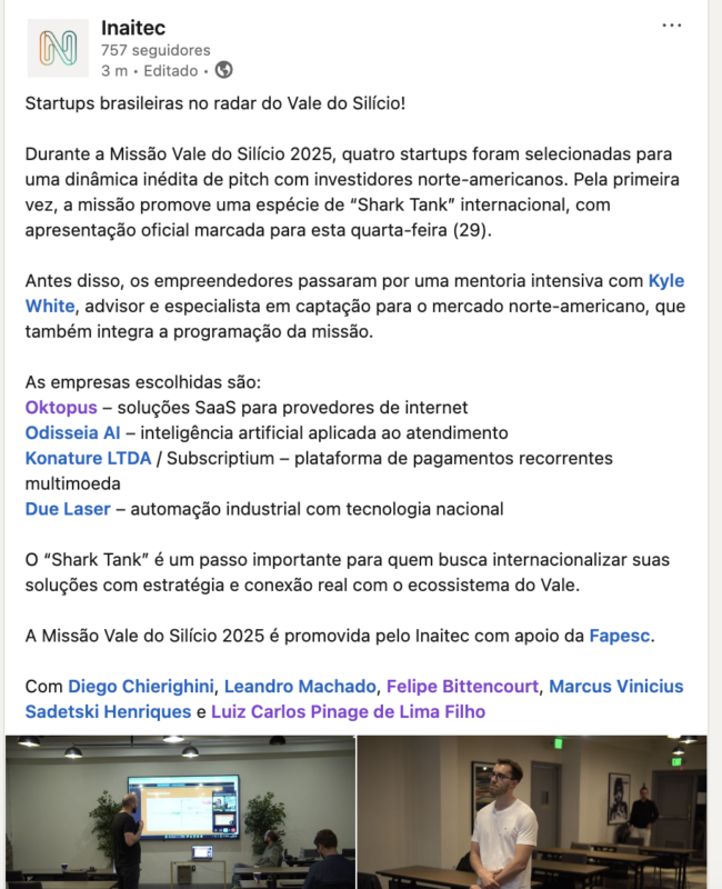“A atuação da Primeira Via nas missões internacionais do Vale do Silício e de Barcelona foi determinante para transformar a percepção e a reputação do Inaitec. A estratégia de comunicação foi pensada de forma integrada, alinhando posicionamento, visibilidade institucional e valorização dos parceiros, o que fez toda a diferença ao longo do projeto.